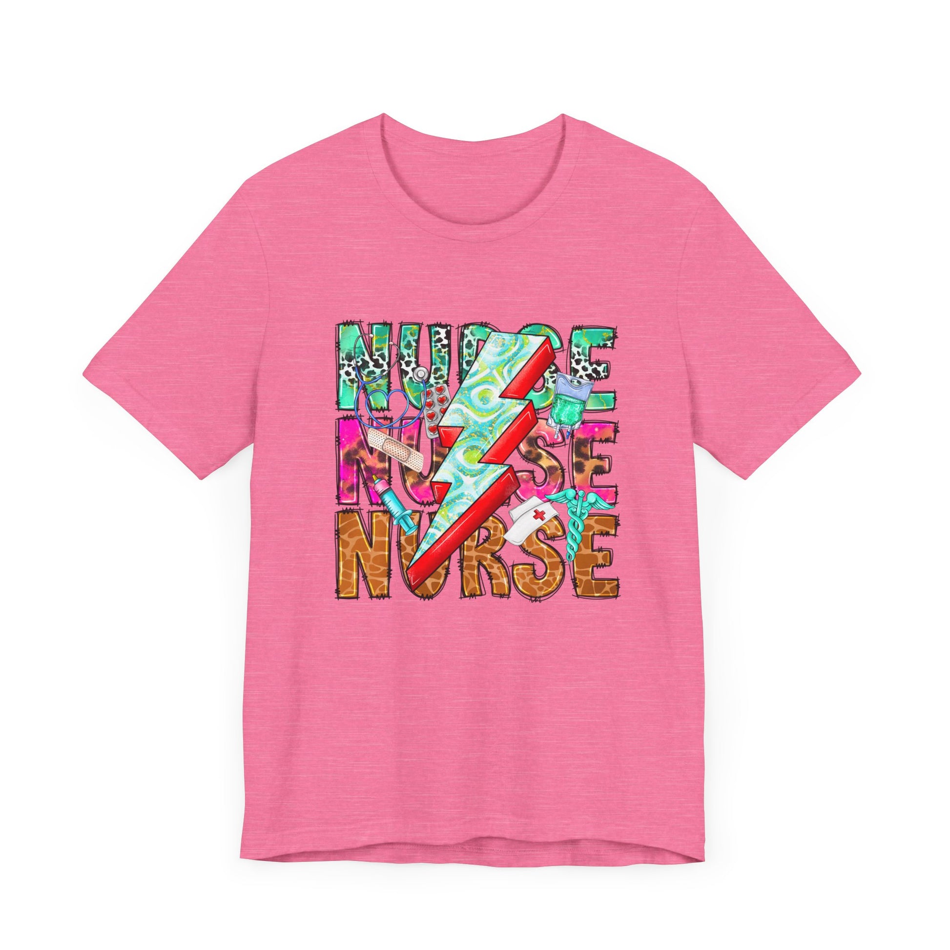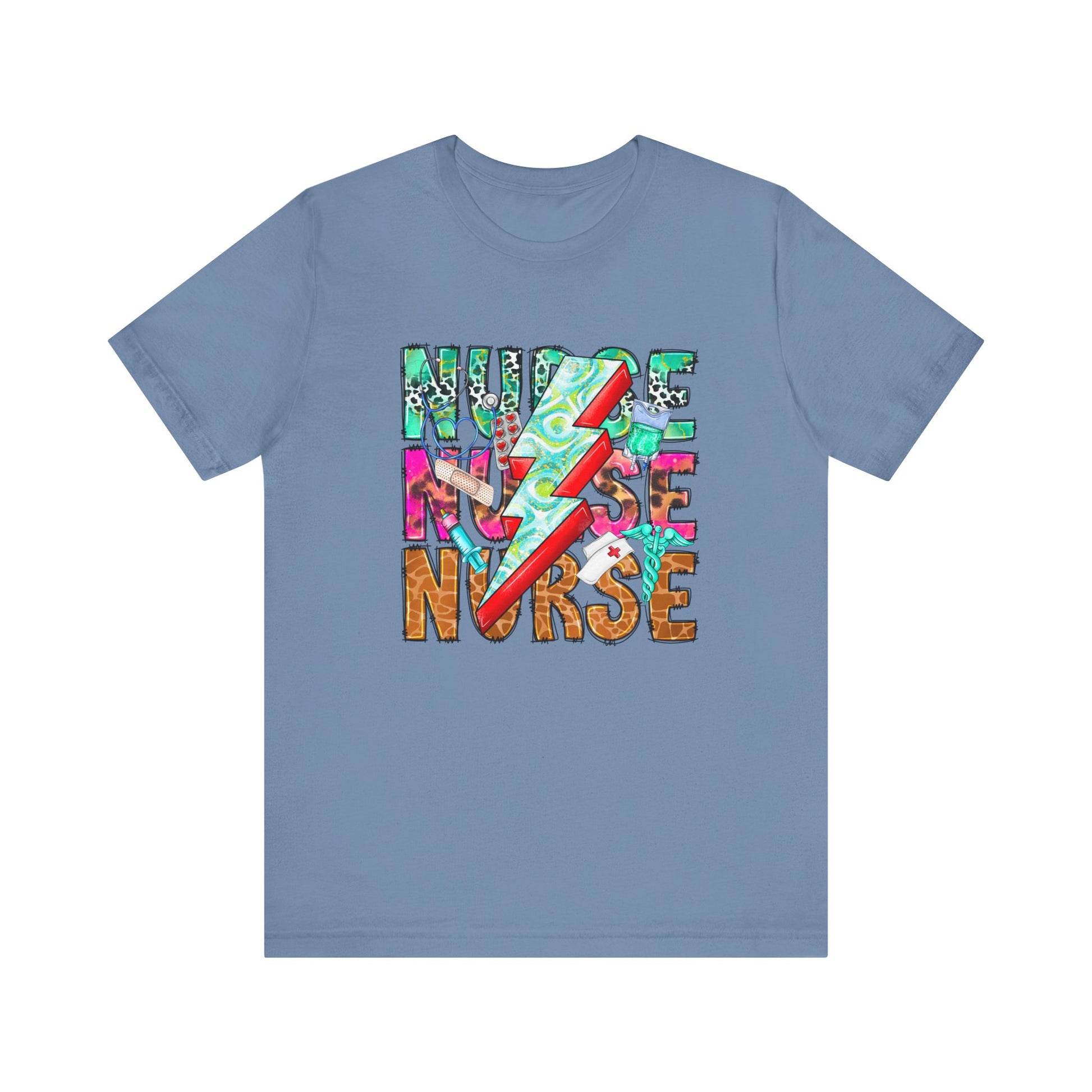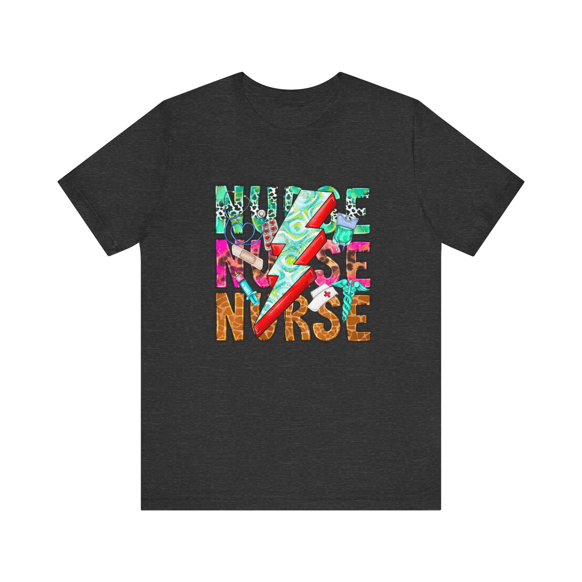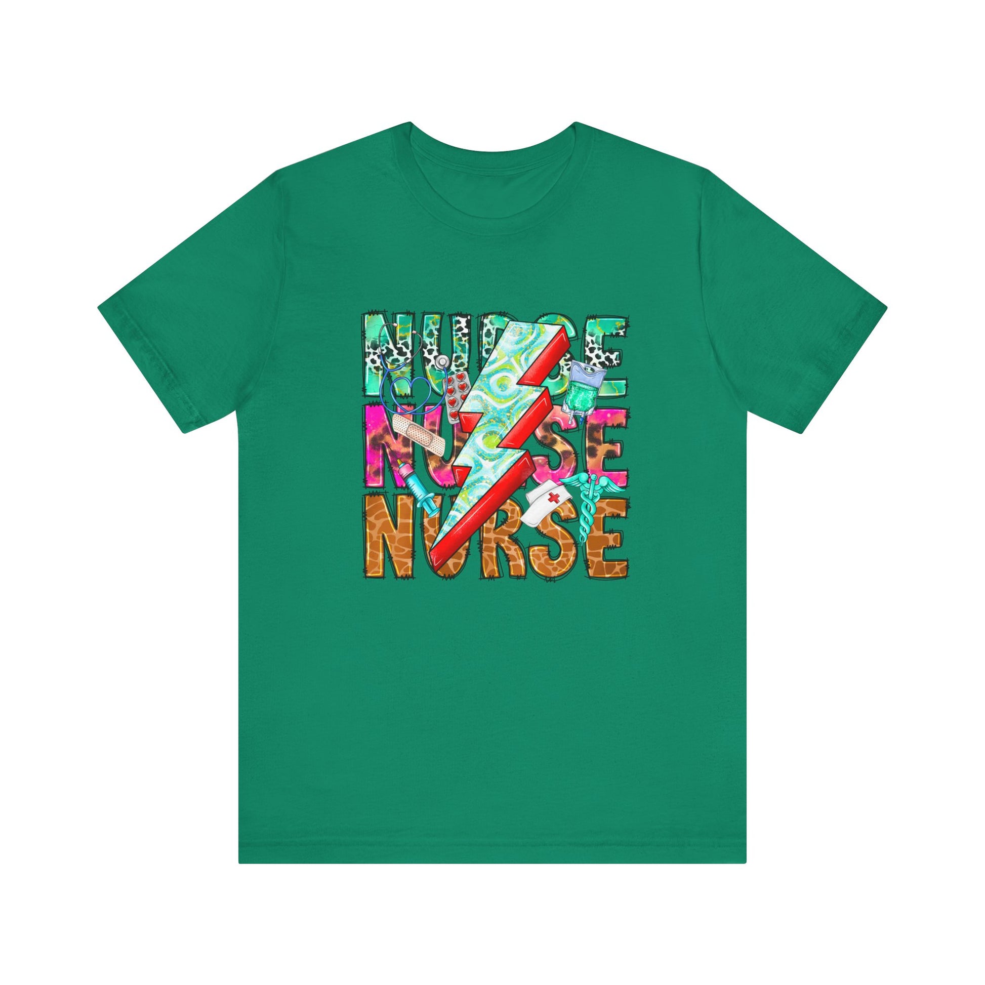 Design: Eye-catching “NURSE” stacked print with a vibrant lightning bolt and medical graphics (stethoscope, IV bag, syringe, and more)